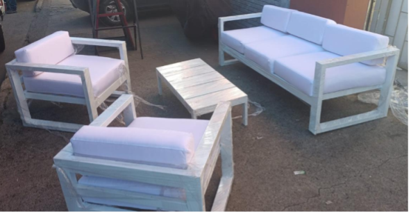 Sala de exterior fabricada en hierro pintada con pintura electrostática y cojineria en lona apta para exterior incluye sofá principal de dos puestos dimensiones 120cm x 70cm x 60cm de alto, dos poltronas  de dimensiones frente 60cm fondo 70cm alto 60cm y mesa de centro de dimensiones frente 100cm fondo 55cm alto 35cm. Pueden cambiar el tono de estructura y cojinería.