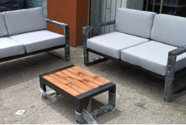 Sala de exterior fabricada en hierro pintada con pintura electrostática y cojinería en lona apta para exterior incluye sofá principal de dos sofás de dos puestos dimensiones 120cm x 70cm x 60cm de alto,  cada uno y mesa de centro de dimensiones frente 80cm fondo 80cm alto 35cm. Pueden cambiar el tono de estructura y cojinería.